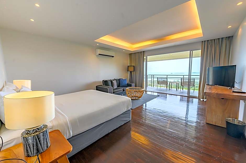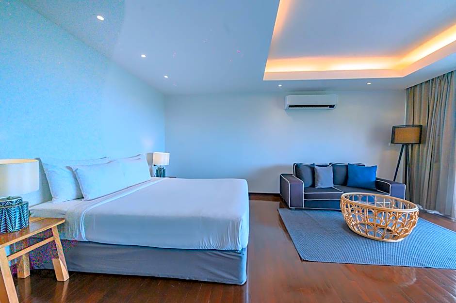 The Love Ocean View Rooms benefit from stunning panoramic sea views over the Gulf of Siam from spacious balconies with two private sunbeds. These 67 square yards(720 square feet) studios feature a king-size bed with 400-thread cotton sheets, a sofa, a TV, a refrigerator and tea/coffee-making facilities. The private bathrooms enjoy a walk-in rain shower and twin vanity sinks. Their relaxing seating area features sand-color tile flooring, white curtains and earthy tones with hints of ocean-blue in the decor. The rooms are cooled by low-noise inverter-type air-conditioning systems.