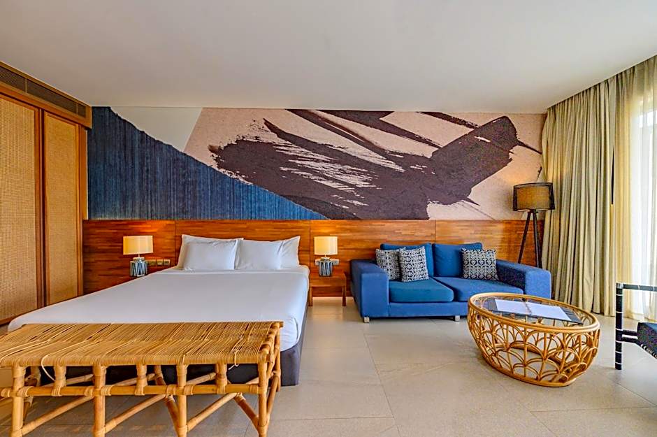 The Love Ocean View Rooms benefit from stunning panoramic sea views over the Gulf of Siam from spacious balconies with two private sunbeds. These 67 square yards(720 square feet) studios feature a king-size bed with 400-thread cotton sheets, a sofa, a TV, a refrigerator and tea/coffee-making facilities. The private bathrooms enjoy a walk-in rain shower and twin vanity sinks. Their relaxing seating area features sand-color tile flooring, white curtains and earthy tones with hints of ocean-blue in the decor. The rooms are cooled by low-noise inverter-type air-conditioning systems.